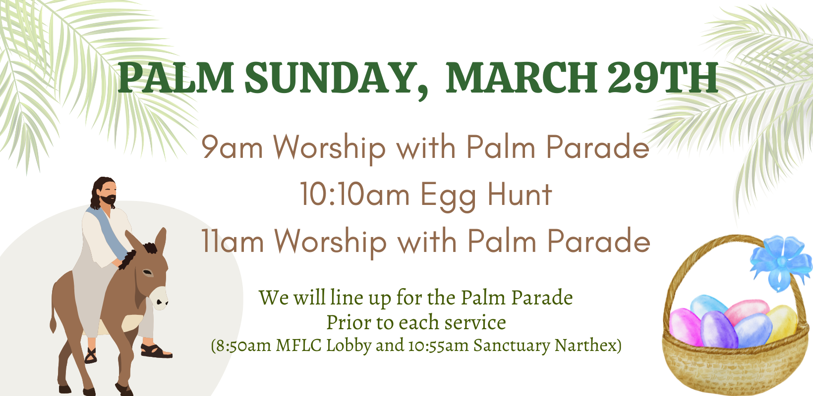 Join us before or after the egg hunt for our special Palm Sunday worship services at 9 or 11am. Children lead our Palm Parade in worship in honor of the day Jesus entered Jerusalem.